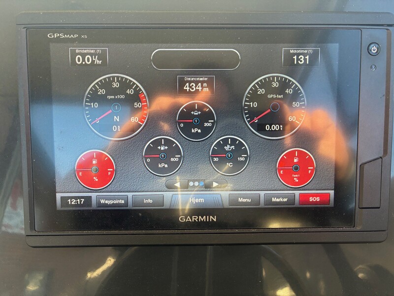 M/Garmin GPSMap 922xs m/transducer og søkort, Garmin VHF115i m/VHF antenne, Mercury Gateaway monteret på NMEA2000 med motordata på Garmin skærmen. M/badestige, horn, ekstra motorbeslag hvor der sidder en Mercury F6 hk 4-takt som reserve- og hjælpemotor som er fra 2022.